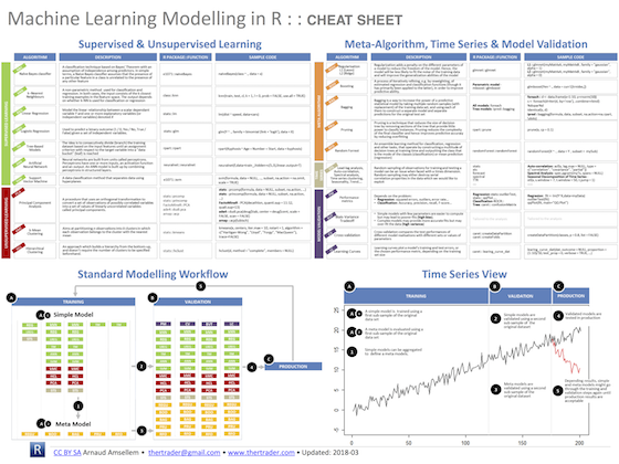 Analysis and Dissemination 6. Machine learning in R. For those interested in machine learning and looking for patterns in high dimensional data, there are a wealth of packages available in R. This cheat sheet is a nice summary of the more popular ones, organized by the class of machine learning approach. https://github.com/rstudio/cheatsheets/raw/master/Machine%20Learning%20Modelling%20in%20R.pdf